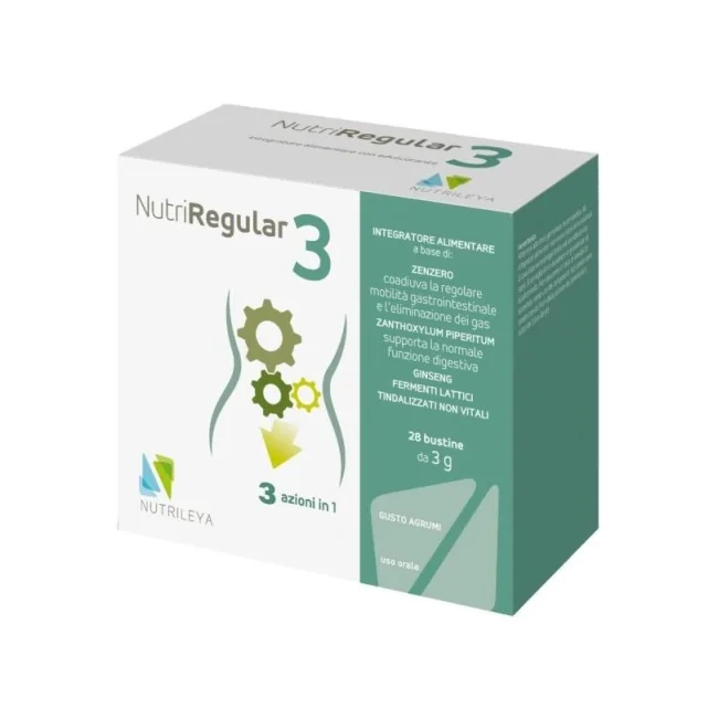 Nutriregular 3 28 Bustine è un integratore alimentare pensato per supportare la salute digestiva e la regolarità intestinale. Contiene un mix di ingredienti, tra cui zenzero, pepe di Sichuan, ginseng e fermenti lattici probiotici, che lavorano insieme per favorire la normale funzione digestiva e la motilità intestinale.