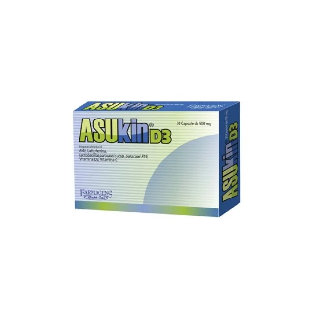 Asukin D3 30 Capsule 450mg integratore alimentare multifunzionale con un contenuto standardizzato di acidi grassi insaponificabili derivanti da Avocado/Soia (ASU) con Lattoferrina, Lactobacillus paracasei subsp. Paracasei F19, Vitamina D3 e Vitamina C.