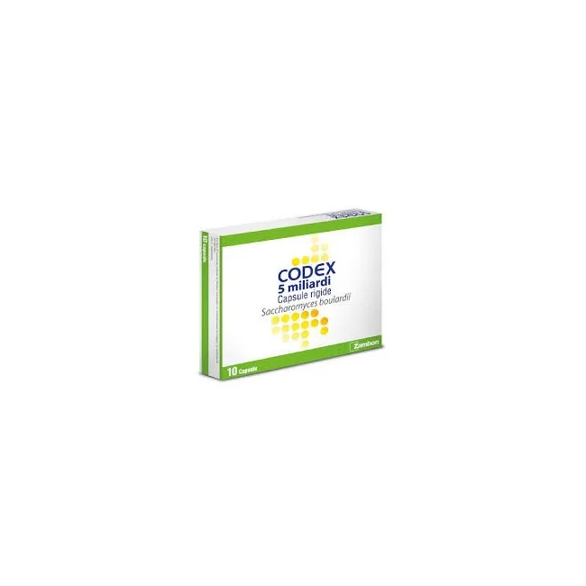 Codex 5 miliardi capsule rigide Ogni capsula contiene: principio attivo: Saccharomyces boulardii 5 miliardi di germi vivi (sotto forma di 250 mg di polvere liofilizzata). Per l’elenco completo degli eccipienti, vedere paragrafo 6.1.
