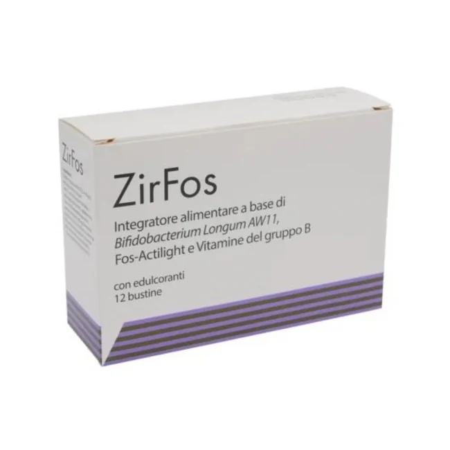 Zir fos è costituito da Bifidobatteri vivi gastroprotetti (5 miliardi per bustina) e frutto-oligosaccaride Actilight (prebiotico) e vitamine gruppo B, componenti ad attività simbiotica per il riequilibrio della flora batterica intestinale.