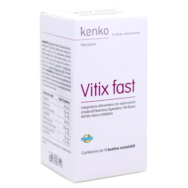 Kenko Vitix Fast è un integratore con edulcoranti a base di diosmina, esperidina ed estratti vegetali. Il mirtillo e la vite rossa sono utili per le loro proprietà antiossidanti. Il meliloto favorisce la funzionalità della circolazione venosa, del plesso emorroidario ed il drenaggio dei liquidi corporei.