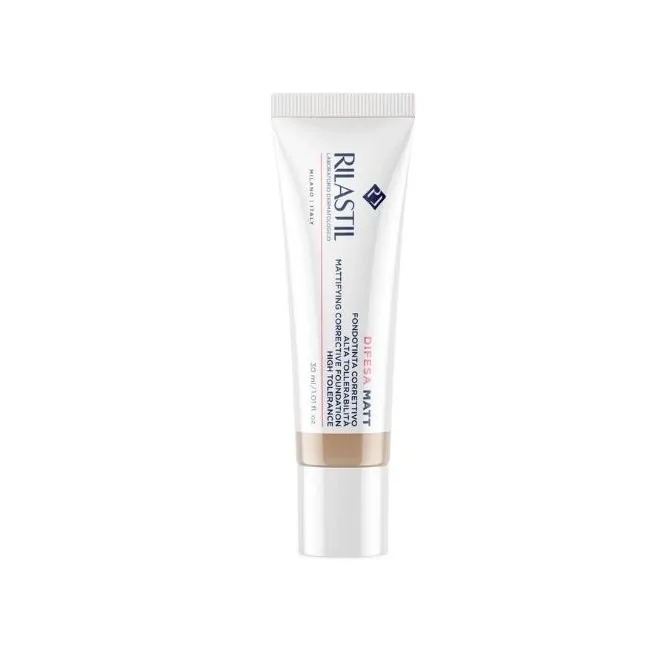 Rilastil Fondotinta Correttivo Matt è un fondotinta fluido ad alta coprenza, specificamente formulato per le pelli miste, grasse e a tendenza acneica. La sua azione principale è quella di uniformare l'incarnato e correggere le imperfezioni, controllando l'eccesso di sebo e opacizzando la pelle per un finish mat.
