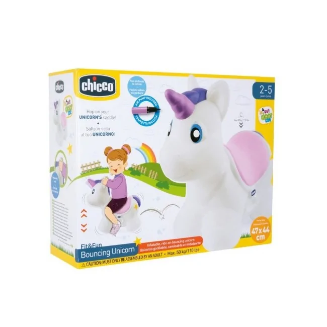 Il Chicco Gioco Unicorno Gonfiabile è un cavalcabile (bouncy toy) progettato per permettere ai bambini di saltare e rimbalzare sia in casa che all'aperto. Ideale per bambini dai 2 ai 5 anni, è dotato di una sella ergonomica e maniglie (le orecchie dell'unicorno) per afferrare il gioco, stimolando così lo sviluppo dell'equilibrio e delle capacità motorie. Formato: 1 pezzo