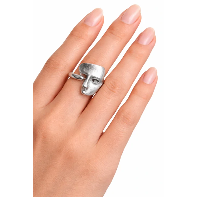 Anello argento maschera stilizzata di Squake è un gioiello in Argento che esplora il concetto di identità attraverso una maschera dal design contemporaneo e deciso. La sua struttura solida e la finitura luminosa lo rendono il talismano perfetto da indossare con orgoglio ogni giorno. Formato: 1 pezzo