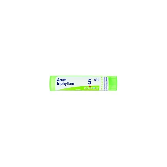 Boiron Arum Tryphillum 5ch Granuli medicinale Omeopatico è un rimedio omeopatico preparato attraverso un processo di diluizione e dinamizzazione, che consiste nel diluire ripetutamente una sostanza di partenza (vegetale, animale o minerale) e nel sottoporla a scuotimenti energici. Questo processo, secondo i principi dell'omeopatia, potenzia l'azione del rimedio.