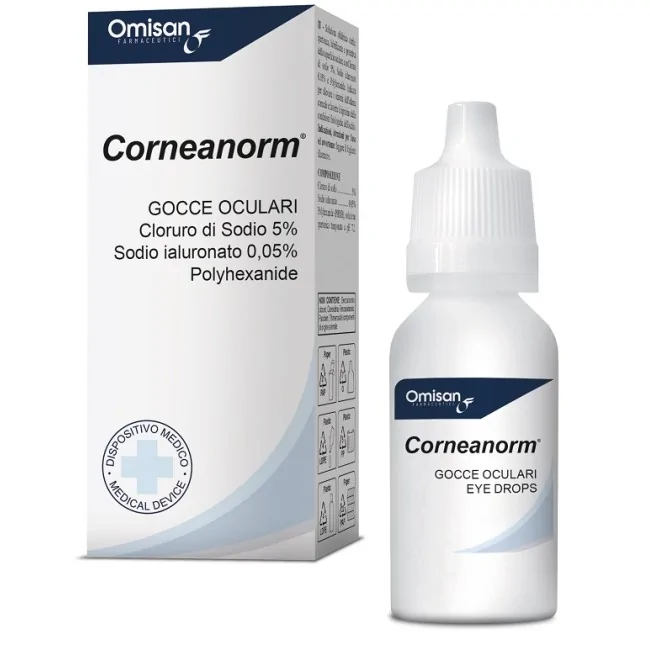 Corneanorm Gocce Oculari è una soluzione oftalmica sterile ipertonica, formulata con cloruro di sodio al 5% e acido ialuronico, indicata per il trattamento dell'edema corneale. Formato: 10 ml