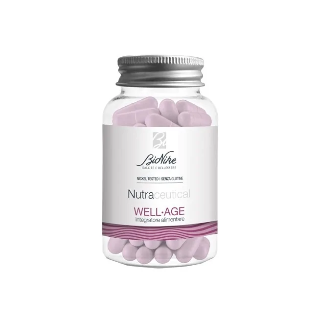 Nutraceutical well-age è un untegratore alimentare che facilita la formazione del collagene dermico e il trofismo della pelle. Formato: 60 capsule