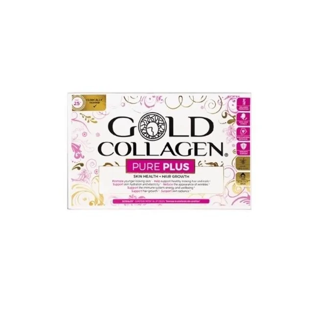 Gold Collagen Pure Plus è un integratore alimentare a base di collagene ed estratti vegetali, utile per favorire il benessere di pelle e capelli. Formato 10 flaconcini