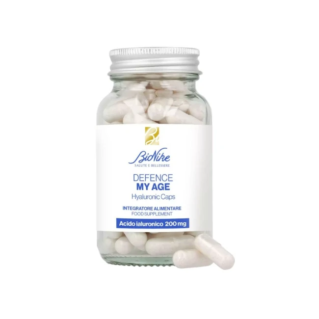 Bionike Defence My Age Acido Ialuronico è un integratore alimentare a base di acido ialuronico a basso peso molecolare e vitamina C, formulato per idratare la pelle dall'interno e contrastare i segni dell'invecchiamento cutaneo. Formato: 60 capusle