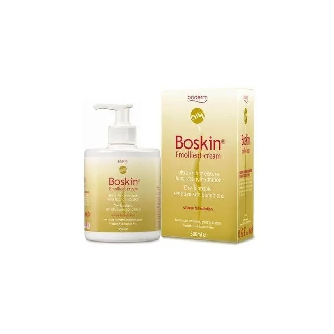 La sua formulazione unica è ricca di acido ialuronico, glicerina, d-pantenolo, burro di karité, vitamina E, olea europea, aloe in gel, estratto di propoli, miele. La combinazione degli ingredienti di BOSKIN Crema Emolliente aiuta a ridurre i sintomi della pelle secca, protegge la pelle a tendenza atopica e migliora la funzione fisiologica della barriera lipidica cutanea. È indicato per la pelle secca e irritata di neonati, bambini e adulti.