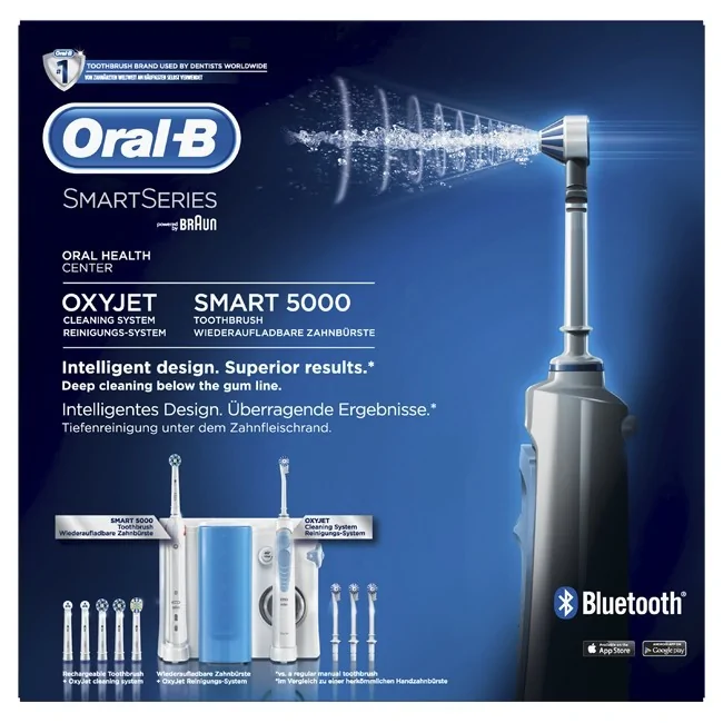 Oral-B Smartseries Oxyjet + Smart 5000 è un kit di igiene orale di ultima generazione che combina l'azione pulente dello spazzolino elettrico Smart 5000 con l'idropulsore Oxyjet, per una pulizia profonda e completa della bocca.