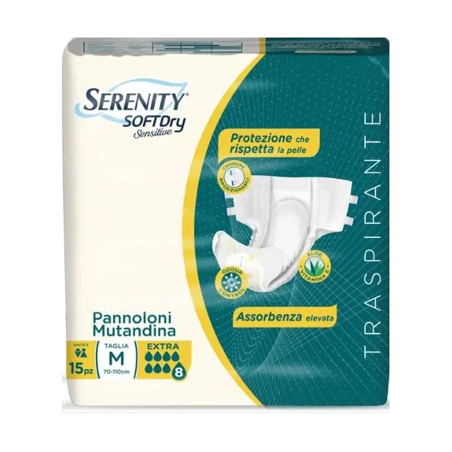 Serenity Soft Dry Sensitive Pannolone Extra Taglia M è un pannolone a mutandina (all-in-one) con chiusure adesive, progettato per la gestione dell'incontinenza moderata e grave. Questa confezione contiene 15 pezzi e la taglia M è ideale per una circonferenza vita compresa tra 70 e 110 cm, offrendo protezione e comfort elevati.