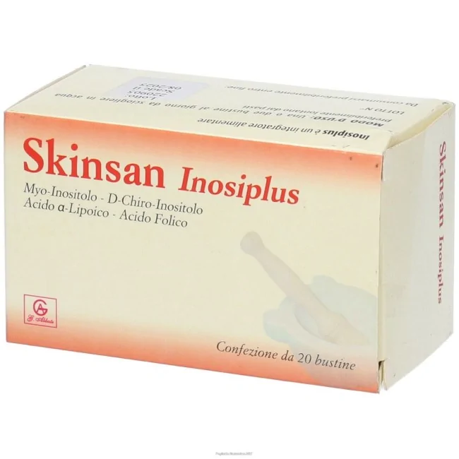 Skinsan Inosiplus è un integratore alimentare a base di myo-Inositolo, D-chiro-inositolo, acido alfa lipoico ed acido folico.