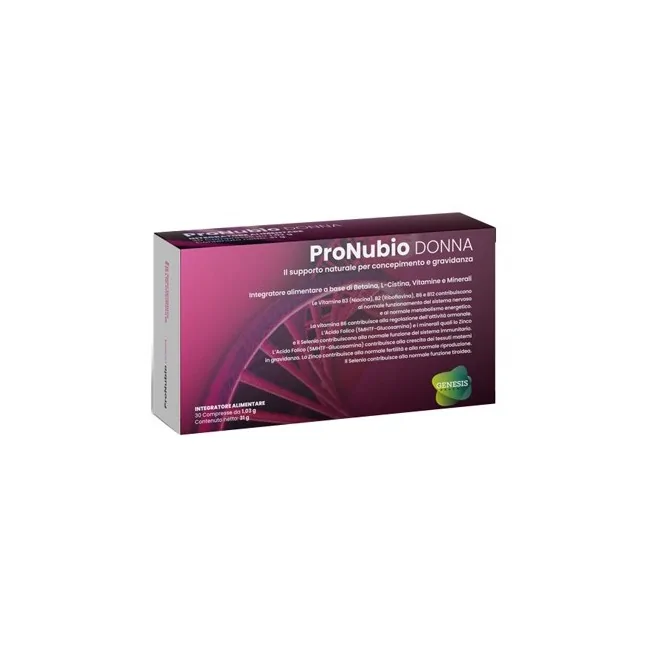 Pronubio Donna è un integratore alimentare a base di betaina, L-cistina, vitamine e minerali. Le vitamine B3 (Niacina), B2 (Riboflavina), B6 e B12 contribuiscono al normale funzionamento del sistema nervoso e al normale metabolismo energetico. La vitamina B6 contribuisce alla regolazione dell'attività ormonale. L'acido folico (5MHTF-glucosamina) e i minerali quali zinco e selenio contribuiscono alla normale funzione del sistema immunitario. L'acido folico (5MHTF-glucosamina) contribuisce alla crescita dei tessuti materni in gravidanza. Lo zinco contribuisce alla normale fertilità e alla normale riproduzione. Il selenio contribuisce alla normale funzione tiroidea.