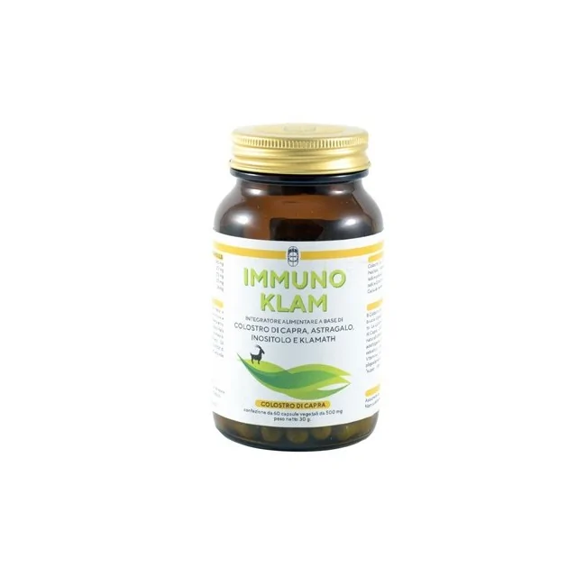 Immuno Klam Colostro di Capra Klamath è un integratore alimentare che combina il colostro di capra liofilizzato con l'alga Klamath. Formulato per supportare le difese immunitarie e il benessere generale. Formato: in 60 capsule vegetali.