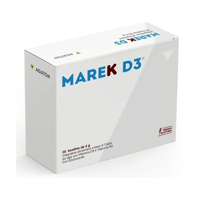 Marek d3 bustine è un integratore alimentare a base di calcio da alga con vitamina D3 e vitamina K2, utile per apportare una quota supplementare di tali componenti all'alimentazione quotidiana.