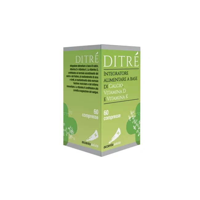 Ditrè Farmà Accento Salute è un integratore a base di Calcio, Vitamina D e Vitamina K per il benessere di ossa e denti. La sua formula supporta il normale assorbimento del calcio, il mantenimento della funzione muscolare e la salute ossea. Formato: 60 compresse