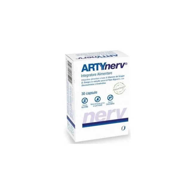 Integratore alimentare a base di vitamine del gruppo B, omega-3 (DHA ed EPA), acido lipoico, vitamina C e estratto fluido di Piper nigrum L. contiene inoltre glucosammina e condroitina, principali componenti della cartilagine articolare, e un estratto di gommoresine di mirra ad alto contenuto di furanodieni. Le vitamine del gruppo B, presenti nella formulazione Artynerv, contribuiscono al normale metabolismo energetico. in aggiunta: o le vitamine B2 (riboflavina), B5 (acido pantotenico), B6 e B12 contribuiscono alla riduzione della stanchezza e dell'affaticamento; o le vitamine B1 (tiamina), B12 e B2 contribuiscono al normale funzionamento del sistema nervoso; o l'acido pantotenico (vitamina B5) contribuisce alla normale sintesi e al normale metabolismo di alcuni neurotrasmettitori; o le vitamine B6 e B12 contribuiscono alla normale funzione del sistema immunitario; o la vitamina B2 (riboflavina) contribuisce alla protezione delle cellule dallo stress ossidativo. La formulazione Artynerv include inoltre acidi grassi omega-3 contenenti DHA ed EPA. Il DHA contribuisce al mantenimento della normale funzione cerebrale (l'effetto benefico si ottiene con un'assunzione giornaliera di 250 mg di DHA). L'estratto fluido di Piper nigrum L., titolato all'80% in beta-cariofillene ha attività antiossidante. Artynerv contiene inoltre vitamina C, che contribuisce al normale funzionamento del sistema nervoso ed immunitario e alla protezione delle cellule dallo stress ossidativo. la vitamina c contribuisce alla normale formazione di collagene per la normale funzione delle ossa, delle cartilagini, e dei vasi sanguigni.