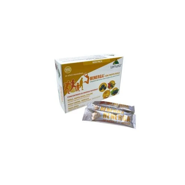 Lemuri@ Henerga Pappa Reale è un integratore alimentare in stick liquidi a base di pappa reale fresca, miele di acacia e vitamina B6. È formulato per fornire energia, supportare il sistema immunitario e contrastare la stanchezza fisica e mentale. Formato: 10 stick