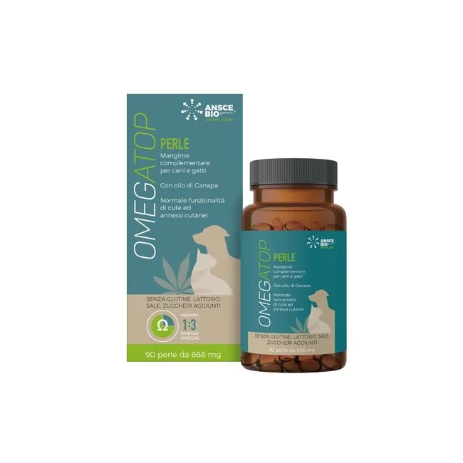 Omegatop perle è un mangime complementare per cani e gatti in perle softgel, ricco in olio di Canapa, ottenuto dalla spremitura a freddo di semi di Cannabis sativa, con acidi grassi essenziali Omega-3 e Omega-6 in rapporto bilanciato 1:3 per favorire la normale funzione di cute ed annessi cutanei. Omegatop Perle è formulato con vitamina A, vitamina E. Senza sale e zuccheri aggiunti.