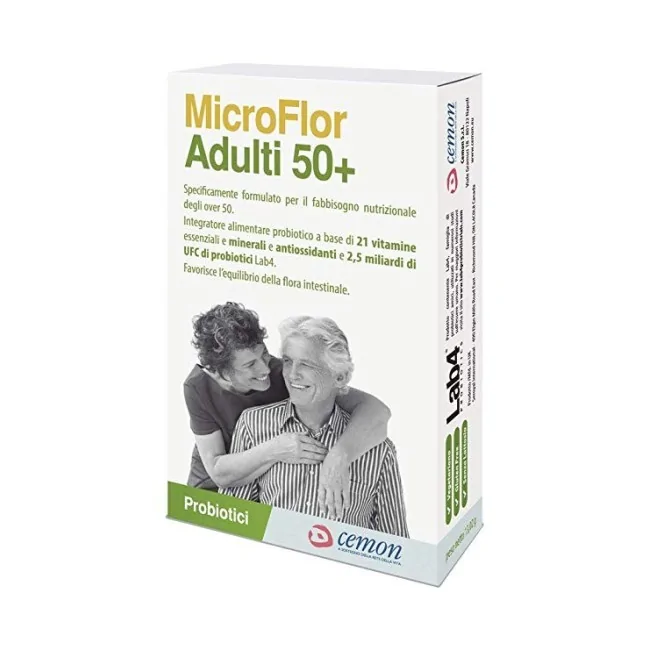 Cemon Microflor adulti 50+ integratore a base di probiotici (2,5 mld UFC) potenziato con 21 vitamine essenziali e minerali e antiossidanti. Specificamente formulato per il fabbisogno nutrizionale degli over 50.