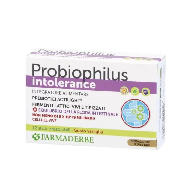 Farmaderbe Probiophilus Intollerance è un integratore alimentare specificamente formulato per sostenere l'equilibrio della flora batterica intestinale in soggetti con intolleranze alimentari. Formato: 12 stick
