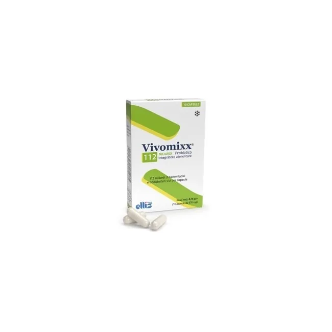 Vivomixx 112 Miliardi è un integratore alimentare ad alta concentrazione di 8 ceppi batterici vivi e liofilizzati (112 miliardi per capsula) formulato per favorire l'equilibrio della flora intestinale. Formato: 10 capsule