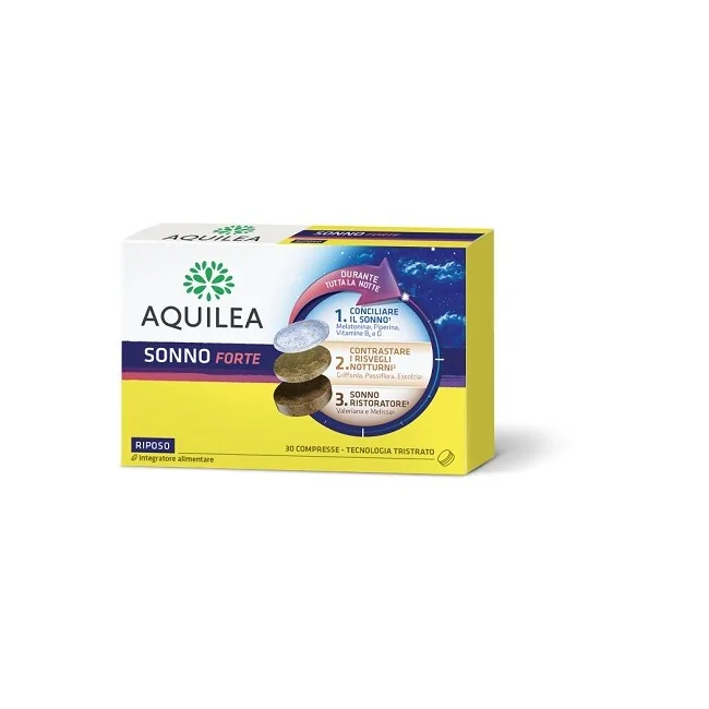 Aquilea Sonno Forte è un integratore alimentare a base di melatonina, vitamine B6 e D3, piperina, griffonia, passiflora, escolzia, melissa e valeriana. La sua formula in compresse tristrato è studiata per modulare il rilascio degli ingredienti durante il corso della notte.