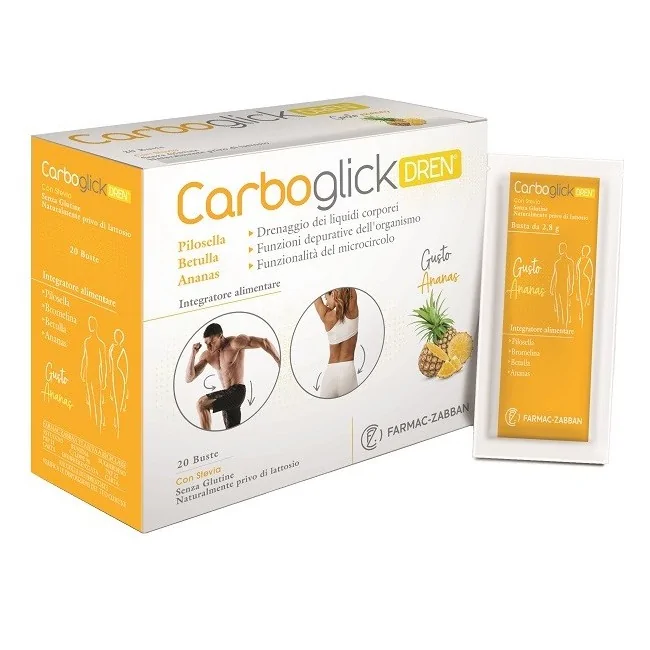 Carboglick Dren è un integratore alimentare a base di pilosella, betulla, ananas utile per favorire il drenaggio dei liquidi corporei. Formato 20 bustine