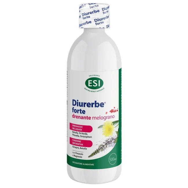 ESI Diurerbe Forte Drenante Melograno è un integratore liquido potenziato con estratti vegetali e minerali, ideale per stimolare la diuresi e contrastare la ritenzione idrica. Formato: 500 ml