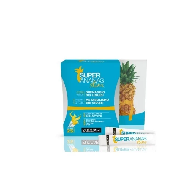 Zuccari Super Ananas Slim è un integratore alimentare a base di ananas, utile per il drenaggio dei liquidi corporei e per l'attivazione del metabolismo. Formato 25 bustine