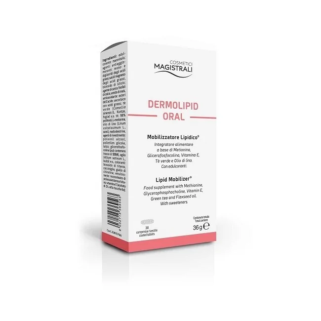 Dermolipid Oral capsule è un integratore alimentare a base di metionina, glicerofosfocolina, vitamina E, tè verde, Allium sativus e olio di lino. La vitamina E, l'Allium sativus e il tè verde (Camellia sinensis) hanno azione antiossidante; inoltre il tè verde favorisce l'equilibrio del peso corporeo e il drenaggio dei liquidi; l'olio di lino (Linum usitatissimum) modula l'assorbimento dei nutrienti e contribuisce al metabolismo lipidico.