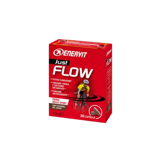Enervit Just Flow è un integratore alimentare di vitamine a base di estratto di cacao titolato in flavanoli. Una dose consigliata (2 capsule al giorno) apporta 200 mg di flavanoli del cacao. I flavanoli del cacao aiutano a mantenere l’elasticità dei vasi sanguigni, la quale contribuisce a un normale flusso sanguigno (*l’effetto benefico si ottiene con un’assunzione giornaliera di 200 mg di flavanoli del cacao).