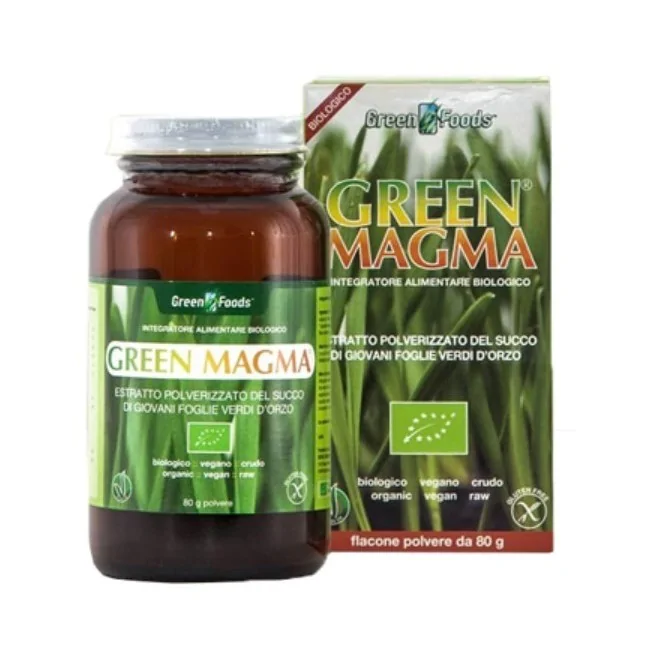 Green Magma è un integratore alimentare biologico a base di estratto polverizzato del succo di giovani foglie verdu d'orzo.