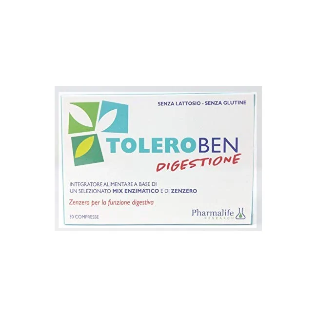 Toleroben Digestione di Pharmalife è un integratore alimentare formulato con un mix di enzimi e zenzero, specificamente progettato per favorire la funzionalità digestiva e svolgere un'attività antinausea. Formato: 30 compresse