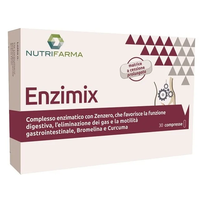 Enzimix compresse è un integratore alimentare con complessi enzimatici, zenzero che favorisce la funzione digestiva, l’eliminazione dei gas e la regolare motilità gastrointestinale, bromelina e curcuma.