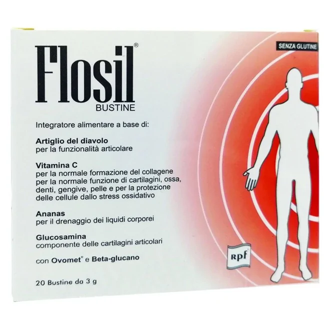 Flosil bustine è un integratore alimentare a base di glucosamina, vitamina C, betaglucano, Ovomet, estratto di ananas e artiglio del diavolo utile contrastare il dolore articolare. Formato: 20 bustine