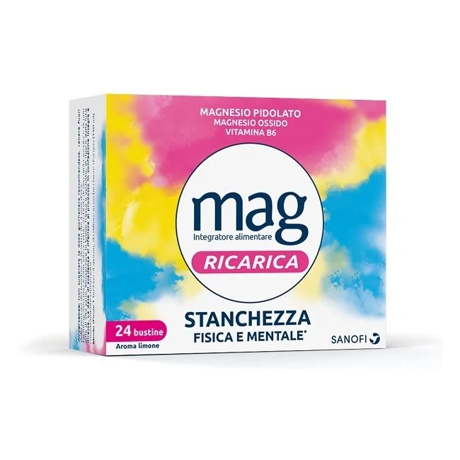 Mag Ricarica 24 Ore a base di a base di magnesio pidolato ed ossido con vitamina B6, utile per contrastare stanchezza ed affaticamento. Formato 24 bustine