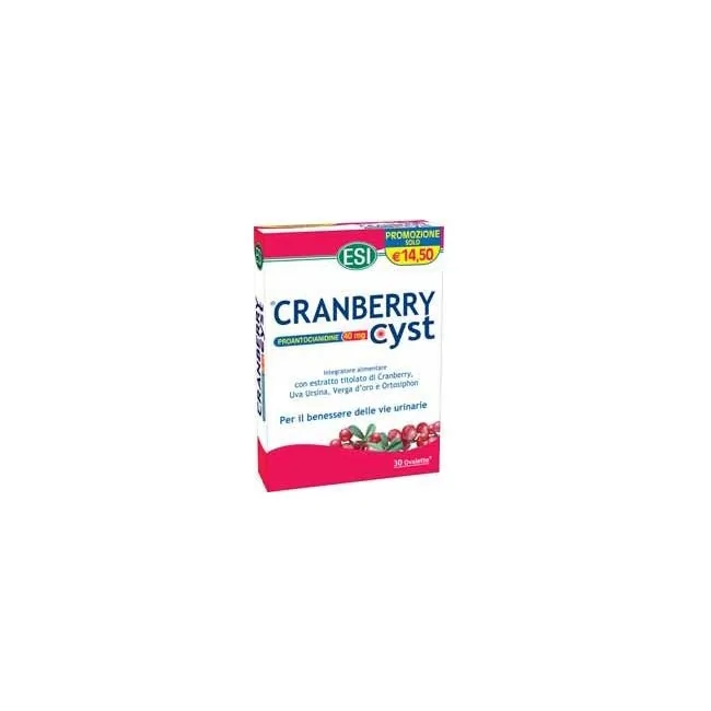 Esi Cranberry Cyst è un integratore alimentare a base di estratto titolato di cramberry , uva ursina, verga d'oro, semi di pompelmo, utile in caso di cistite. Formato 30 ovalette
