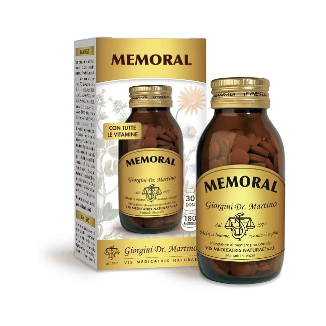 Dr. Giorgini Memoral è un integratore alimentare a base di un complesso sinergico di estratti vegetali (es. Ginkgo, Bacopa, Eleuterococco), vitamine del gruppo B e minerali, formulato per supportare la memoria, la concentrazione e la funzione cognitiva generale. Formato: 180 pastiglie