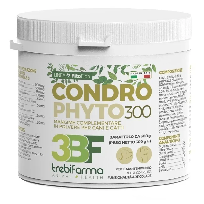 Condrophyto è un mangime complementare per cani e gatti anziani o molto attivi. Serve a supportare la corretta funzionalità osteo-articolare e il trofismo cartilagineo grazie a Glucosamina, Condroitina solfato e MSM. Formato: 300 grammi
