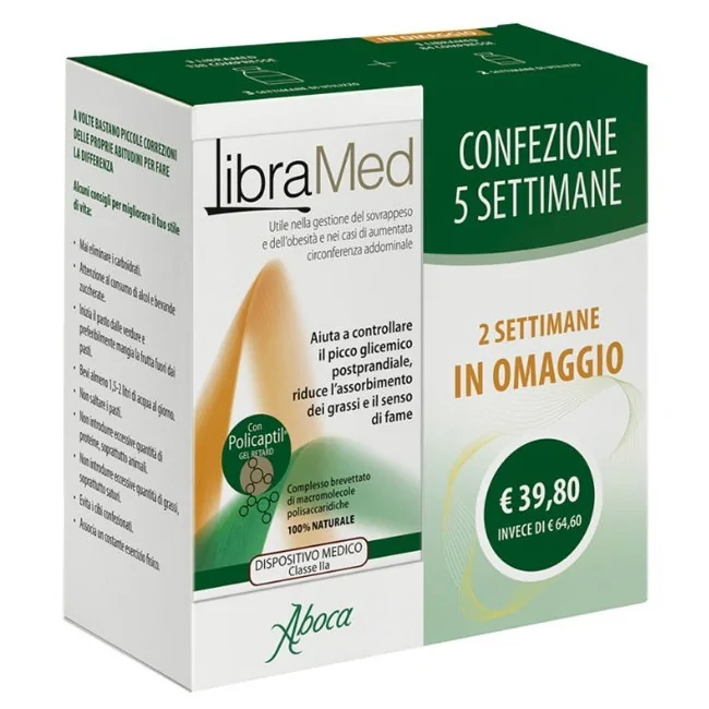 Libramed Trattamento 5 Settimane è un dispositivo medico con macromolecole polisaccaridiche utile nel trattamento del sovrappeso e dell'obesità