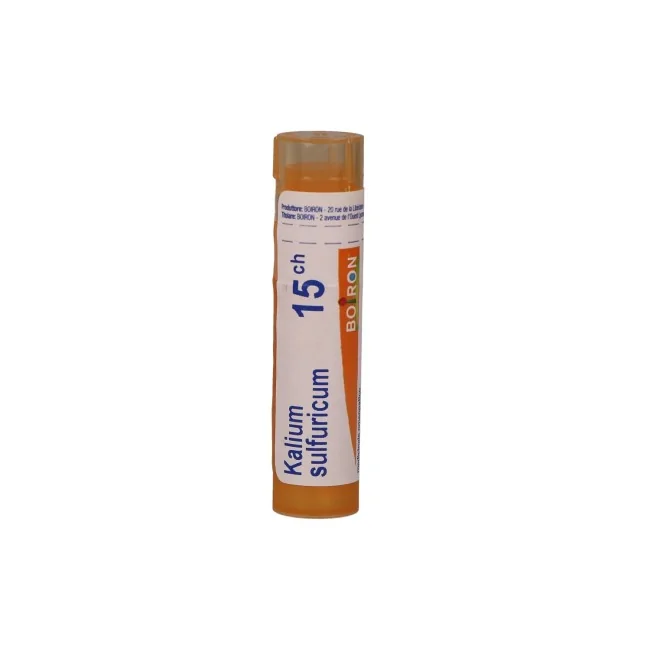 Boiron Kalium Sulfuricum 15ch Granuli medicinale omeopatico è un rimedio omeopatico preparato attraverso un processo di diluizione e dinamizzazione, che consiste nel diluire ripetutamente una sostanza di partenza (vegetale, animale o minerale) e nel sottoporla a scuotimenti energici. Questo processo, secondo i principi dell'omeopatia, potenzia l'azione del rimedio.