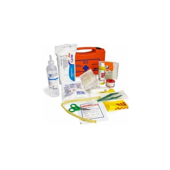 Contiene ml.1000 di disinfettante iodopovidone; 3 flaconi ml.500 di soluzione fisiologica; 5 paia di guanti sterili; 1 mascherina con visiera paraschizzi; 2 buste di garza sterile 18x40; 10 buste da 2 compresse di garza sterile 10x10; 2 teli; 2 pinzette da medicazione sterile monouso; 1 confezione di cotone idrofilo 50 g.; 1 confezione di rete elastica mt.1 cal 10; 4 bende orlate mt.5x10 cm.; 2 astuccio da 20 cerotti assortiti; 2 rocchetto di cerotto in tela mt.5x2,5 cm.: 1 paio di forbici; 3 lacci emostatici; 2 confezioni di ghiaccio secco; 2 bende elastiche; 1 coperta isotermica; 1 termometro con astuccio; 1 sfigmomanometro aneroide; 2 sacchetti portarifiuti; 1 manuale di istruzioni DM 388.