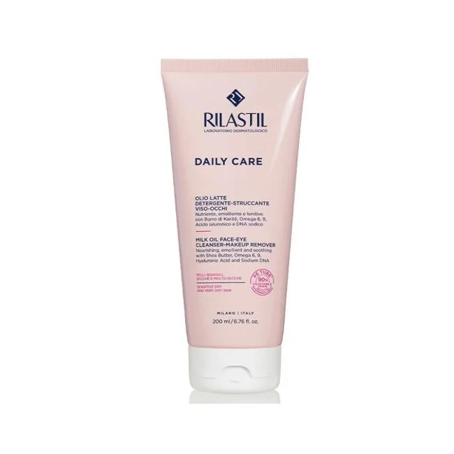 Rilastil Daily Care Olio Latte Detergente è un innovativo detergente dalla texture ricca e avvolgente che unisce l'efficacia struccante di un olio alla delicatezza di un latte detergente. Specificamente formulato per la detersione quotidiana di viso e occhi, è ideale per pelli secche e sensibili, rimuovendo efficacemente trucco e impurità senza alterare il film idrolipidico cutaneo.