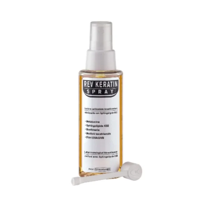 Keratin Spray è la lozione topica anticaduta di Rev Pharmabio, bioattivante, vitalizzante con filtri UVA/UVB. Defluvium stagionale, compendio nell'alopecia in generale ed in tutti gli indebolimenti del cuoio capelluto sia congeniti che indotti da stress, squilibri ormonali, disordini alimentari, tinture, fumo e post parto.