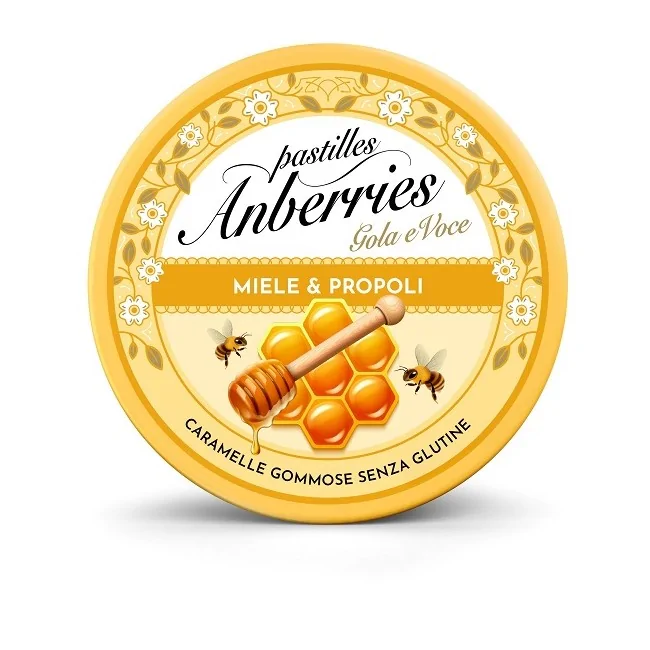 Anberries Caramelle gommose con miele e propoli che donano sollievo e benessere alla gola e alla voce. Sono senza glutine. Formato: 50 grammi