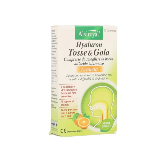 Hyaluron Tosse & Gola Arancia sono compresse masticabili a base di Acido Ialuronico, formulate per idratare la mucosa orofaringea e calmare la tosse secca e l'irritazione della gola. Formato: 30 compresse