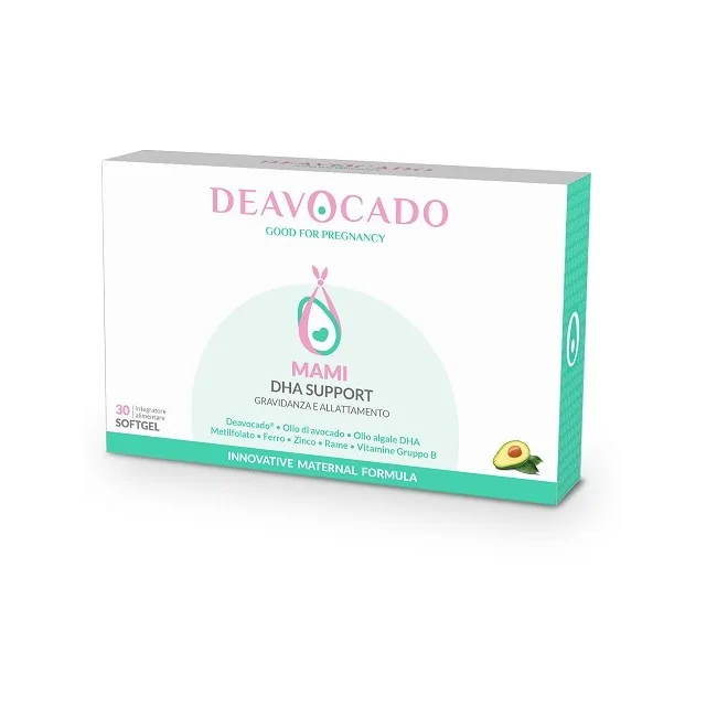 Deavocado Mami DHA Support è un integratore studiato per il benessere della mamma e del bambino durante gravidanza e allattamento. Grazie alla combinazione di DHA da olio di avocado, acido folico e vitamine, sostiene lo sviluppo cerebrale e visivo del feto garantendo un'elevata digeribilità. Formato: 30 softgel