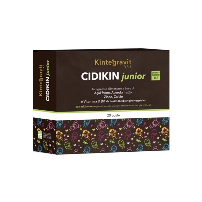 Cidikin Junior bustine è un integratore alimentare a base di açai frutto, acerola frutto, zinco, calcio e vitamina D (D2 da lievito-D3 di origine vegetale).